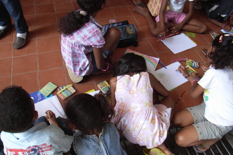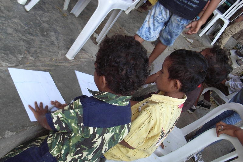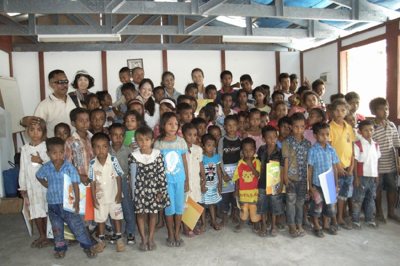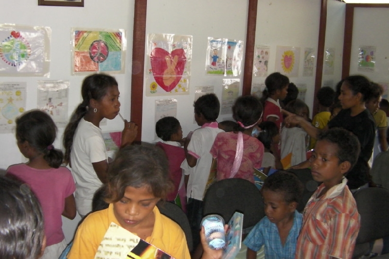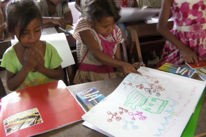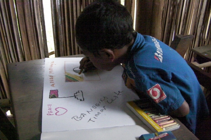 沖縄の子ども達の絵に見入る、東ティモールの子ども達。 | 一心不乱に描く姿を見ていると、自然と涙がこぼれてきました。