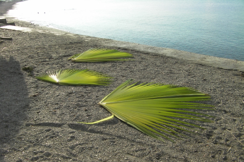 昔ながらの塩つくり。 | 砂浜に干した椰子の葉で、お土産用の民芸品を作っています。 |