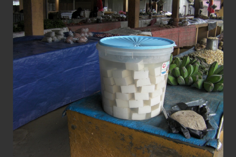 沖縄のタームー(田芋)と同じお芋が並んでいます。椰子の茎を粉にしたクレープなど |