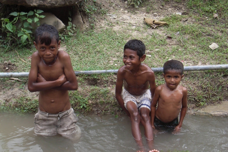 ここが国境の町、Batugade。白黒のバーの向こうはインドネシア。 | 首都Diliに向かう山中、水溜りで遊ぶ子ども達。 |
